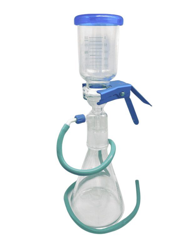 Zestaw do filtracji rozpuszczalników, lejek 300 ml – w całości jest wykonany z wysokiej jakości szkła. Aparat ten nadaje się do usuwania cząstek z rozpuszczalników oraz do oczyszczania roztworów HPLC.
